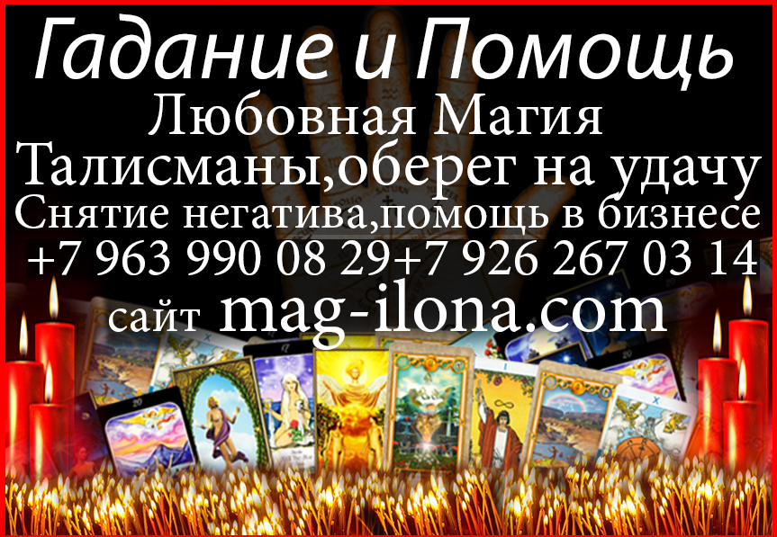 Установку различных защит Определение Причин Неудач Снятие Порчи Сглаза Одиночество Венец Безбрачия Очищение, Снятие Негатива Помощь в любовных делах. Любовная Магия Самые сильные любовные привороты Верну мужа - жену в Семью Восстановлю Отношения Устраню Соперника Изготовление амулетов,оберегов,талисманов на все случаи жизни! Бесплатные онлайн звонки приложения Viber - два номера приложения WhatsApp - два номера Skype Логин ilonamag2 Обращайтесь с вашими проблемами! Вопросами и пожеланиями для вас и ваших близких. Обещаю помочь вам, с божьей помощью! Надо Жить в «ЗДЕСЬ и СЕЙЧАС» © Контакты: +79639900829,+380938506560,+79262670314 Смотрите также: