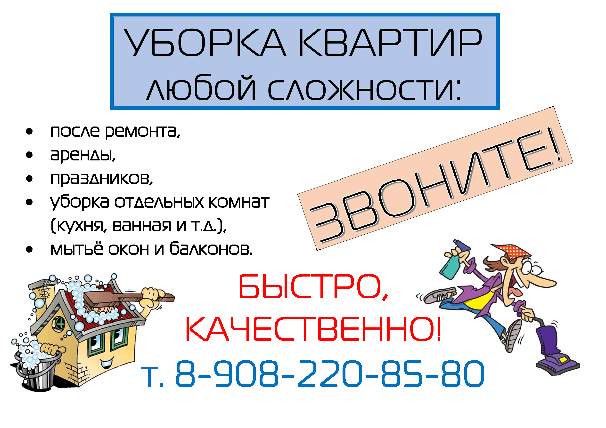 Уборка квартирПосле ремонта, аренды, праздников, уборка отдельных комнат (кухня, ванная и т.д.), мытьё окон и балконов.