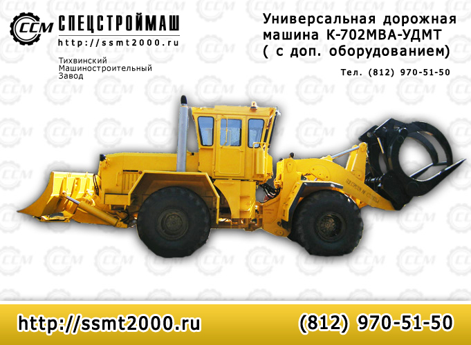 Универсальная дорожная машина К-702МВА-УДМ-ТУниверсальная дорожная машина сочетает в себе функции погрузчика и бульдозера. Предназначена для погрузочных и транспортных работ с сыпучими и кусковыми материалами, разработки и перемещения грунта, рытья котлованов, возведения насыпей, засыпки траншей и ям, прокладывания и расчистки дорог.