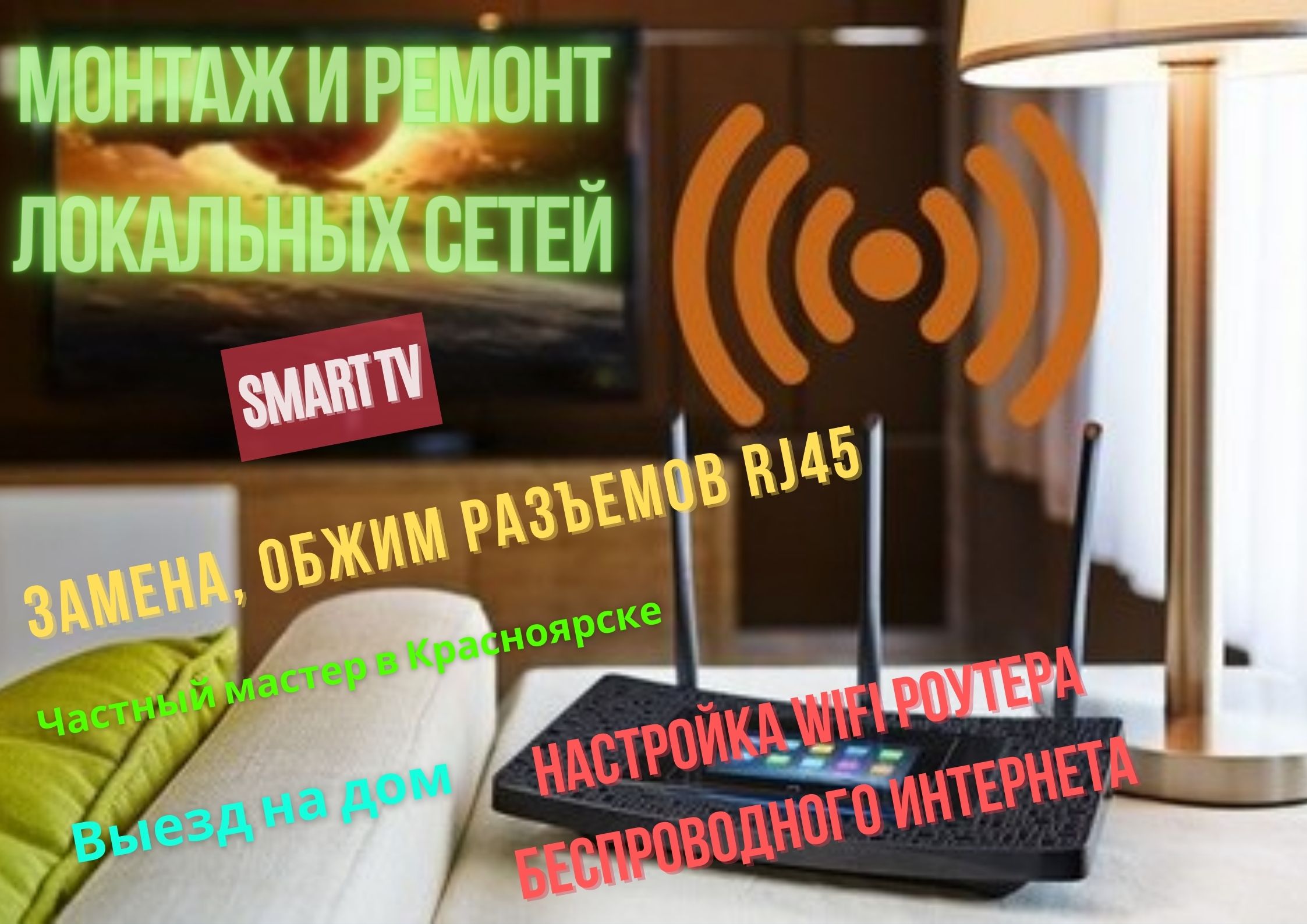Замена коннекторов RJ-45, настройка Wi-Fi роутеров, Smart TV, LAN в КрасноярскеНастройка домашней Wi-Fi(беспроводной) или LAN(проводной) сети. Настройка Smart TV или TV-приставок. Обжим коннекторов RJ-45 на интернет-кабеле - от 300 руб. Прокладка кабеля по дому (офису). Укладка кабеля в плинтус, кабель канал. Ремонт интернет кабеля. Наращивание кабеля переходником. Подключение компьютерных розеток. Сверление отверстий в стенах. Настройка подключения к интернету: Дом.ру, Телекома, Аксиома, Ростелеком, Билайн, Орион телеком и другим провайдерам. Настройка беспроводных сетей. Установка и настройка WI-FI роутера любой модели - Zyxel, Tp-link, Asus, D-link, Netgear, Upvel и др. Подключение и настройка дополнительных устройств к роутеру. Установка, настойка телевизора - от 500 руб. Обращайтесь с любыми компьютерными неисправностями. Выезд в пределах Красноярска в удобное для вас время с 8:00 до 22:00, по будням, а так же в выходные и праздничные дни. Выезд мастера входит в стоимость. Звоните. Номер телефона: +79333312426. Александр - частный мастер.