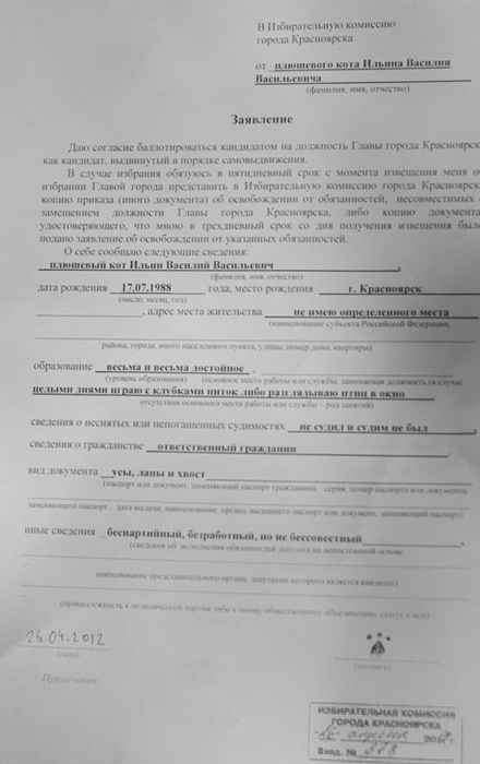 В Красноярске появился необычный кандидат в мэры. Группа активистов заявила на участие в выборах, намеченных на 10 июня, плюшевого кота. Кот был сделан на красноярской фабрике игрушек 24 года назад. По замыслу авторов акции, тем самым, они демонстрируют "плюшевый" характер демократии в стране. Интересно, что в городском избиркоме документы на игрушку приняли и даже поставили печать. Вот только на вопрос – пройдет ли он регистрацию, авторы идеи пожимают плечами. Добавим, что в прошлом году в США жители одного из городов даже выбрали в шутку кота своим мэром. Облако тегов: итоги выборов выборы мэра выборы в Красноярске выборы мэра в Красноярске плюшевый кот в мэры
